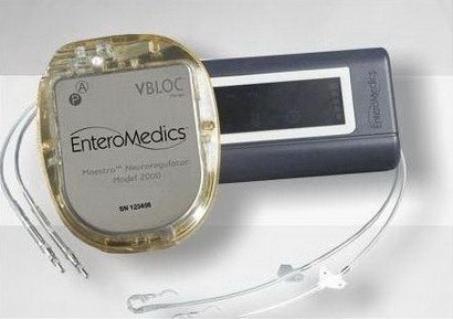 Данное устройство состоит из перезаряжаемого аккумулятора и имплантата, устанавливаемого в стенку желудка в той части, где проходит блуждающий нерв. Устройство производит слабые электрические импульсы определенной частоты, что позволяет блокировать сигналы от желудка к мозгу и приводит к угнетению аппетита.