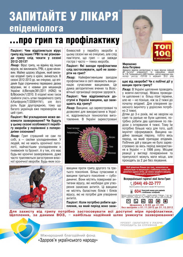 Для того, чтобы помочь украинским предупредить заболевание гриппом, Международный благотворительный фонд «Здоровье украинского народа» в течение ноября - декабря 2012 реализует социальный образовательный проект «Профилактика гриппа».