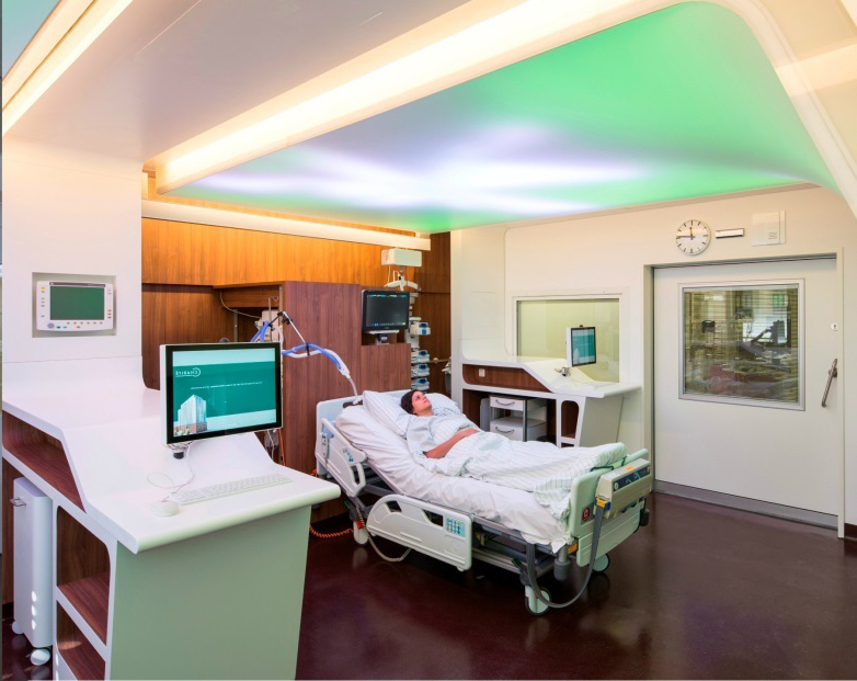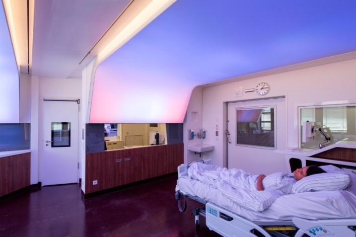 Проект реализован как часть уникальной концепции «Параметрический пространственный дизайн», призванной снижать уровень стресса у пациентов. Решение от Philips сочетает в себе естественное динамическое освещение, воссоздающее дневной свет и мягкий разноцветный визуальный контент. Потолок, созданный из 15 400 светодиодных модулей, переходит на стену напротив кровати пациента и полностью заполняет его поле зрения. Новейшее светодиодное оборудование дает уникальную возможность воспроизводить сценарии, имитирующие яркое летнее небо. Это именно тот уровень светоотдачи, который на биологическом уровне воздействует на процесс восстановления в палате интенсивной терапии. Освещение поддерживает естественные суточные ритмы пациента и способствует здоровому сну.