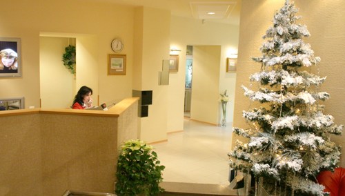 Попадая в фойе для ожидания, сразу обращаешь внимание на изысканность и одновременно простоту стиля интерьера. Цветовая гамма — беж, кофейный, персиковый. На этом фоне контрастирует зона ожидания с ярко красными кожаными диванами. На стене в тон диванам картина с красными маками.