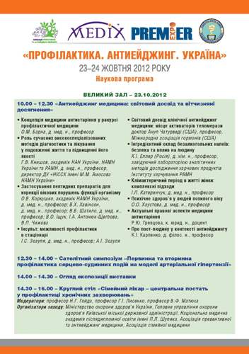 Издательство «Медикс» и «Ассоциация превентивной и антиейджинг медицины», известные своими научно-социальными программами в области профилактической и антиейджинг медицины. В рамках выставки «Здравоохранение - 2012» 23-24 октября проводят Второй Международный Конгресс «ПРОФИЛАКТИКА. АНТИЕЙДЖИНГ. УКРАИНА», который будет освещать новейшие разработки и исследования в области профилактической медицины и медицины антистарения, с привлечением ведущих международных и украинских специалистов.