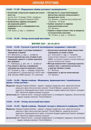 выставки традиционно насыщена конференциями, семинарами, презентациями и дискуссиями на актуальные темы современной медицины. В формировании программы принимают участиепредставители Министерства здравоохранения Украины, Национальной академии медицинских наук, Главного управления здравоохранения Киева, Национальной медицинской академии последипломного образования им. П. Л. Шупика, ВОО «Ассоциация превентивной и антиэйджинг медицины», а также Министерство социальной политики, Федерация работодателей, Ассоциация оздоровительных учреждений и Всеукраинская ассоциация физиотерапевтов и курортологов.